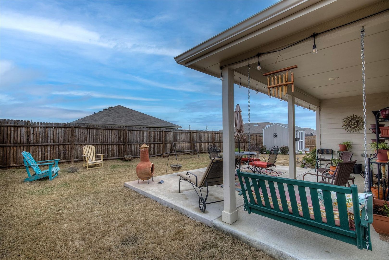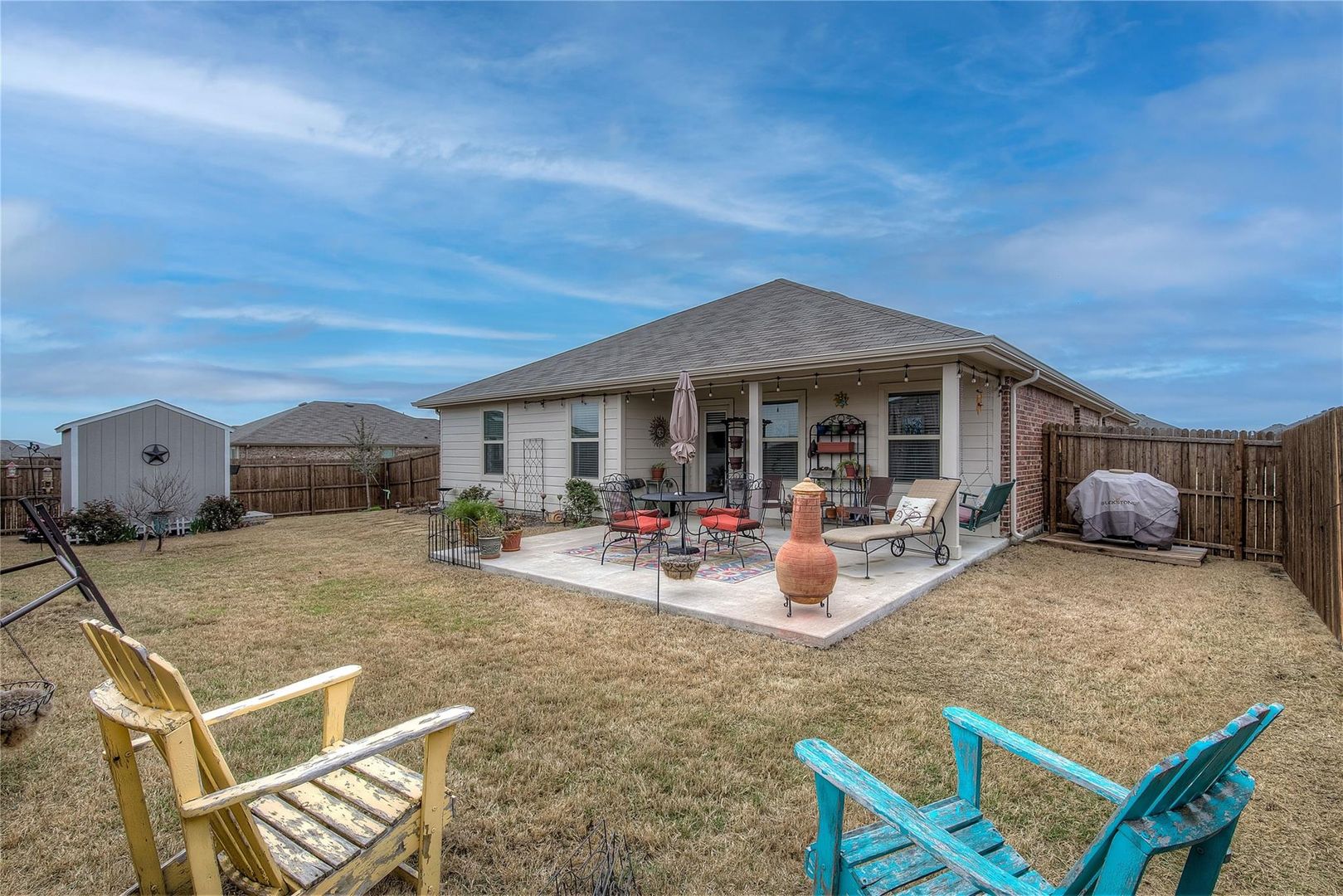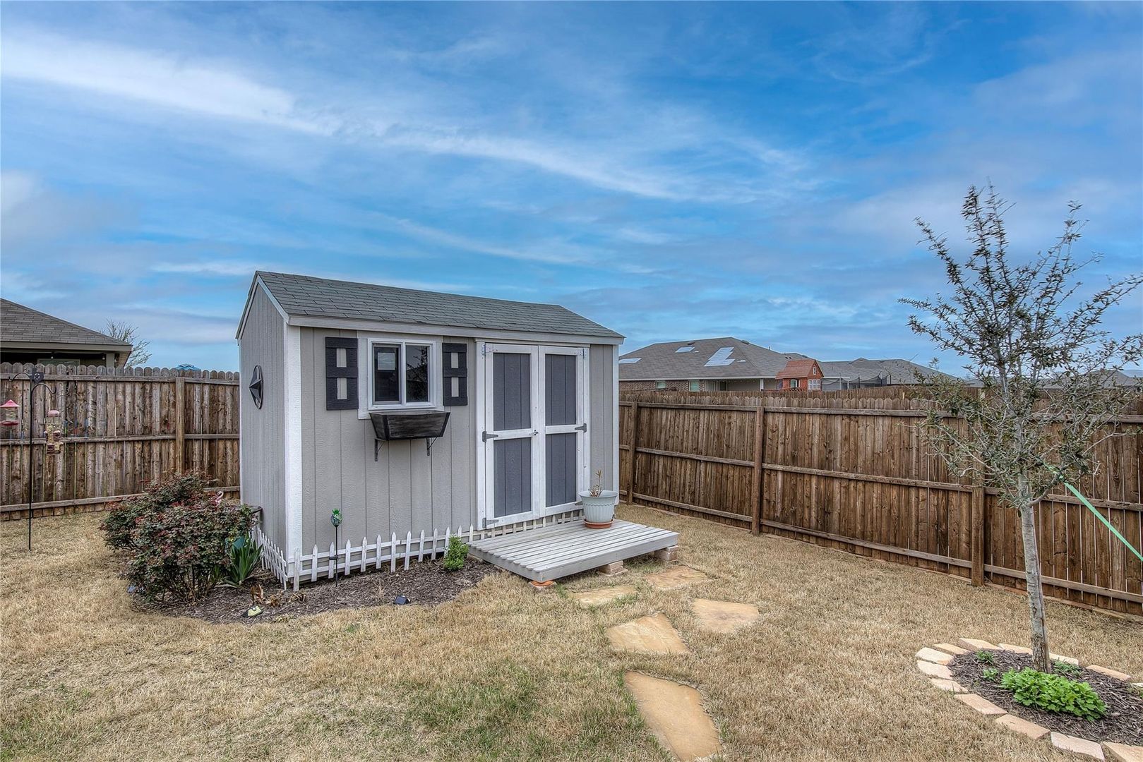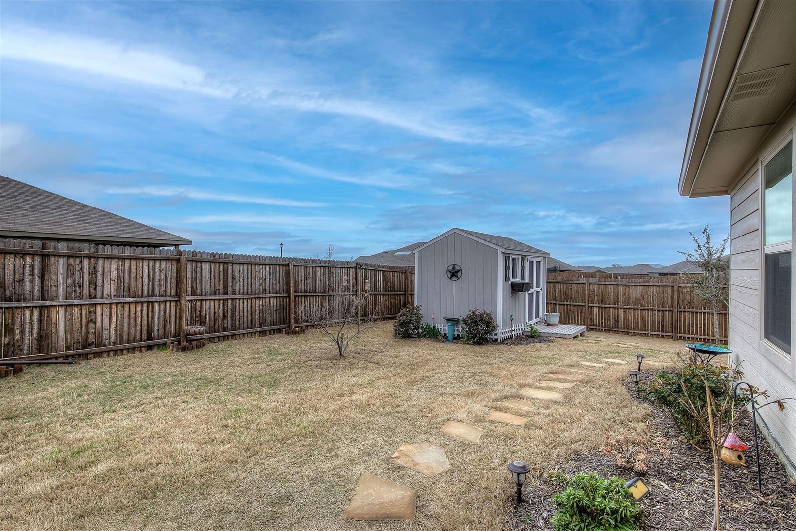 Beautiful home with four bedrooms on a large corner lot in a wonderful neighborhood. The open floor plan featuring a living area opening up to the dining area and island kitchen makes for a great layout for entertaining guests or enjoying family meals. The granite counters and stainless steel appliances are both practical and stylish additions to the kitchen. Nicely sized bedrooms including a large master suite. The private backyard with a covered and extended patio is also a great feature. It provides a nice outdoor living space where you can relax, grill out, or entertain guests. The storage building is also a convenient feature for storing lawn equipment or other items.