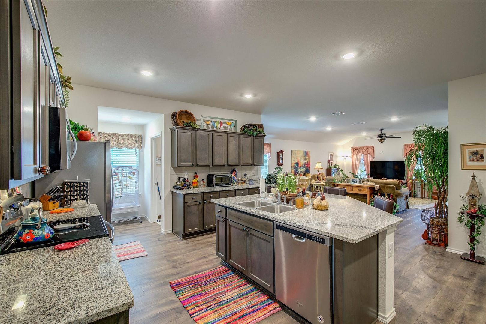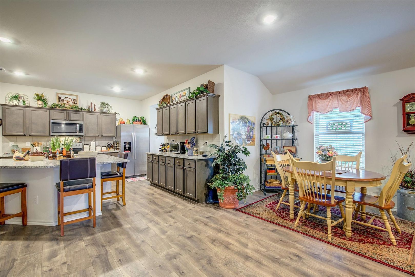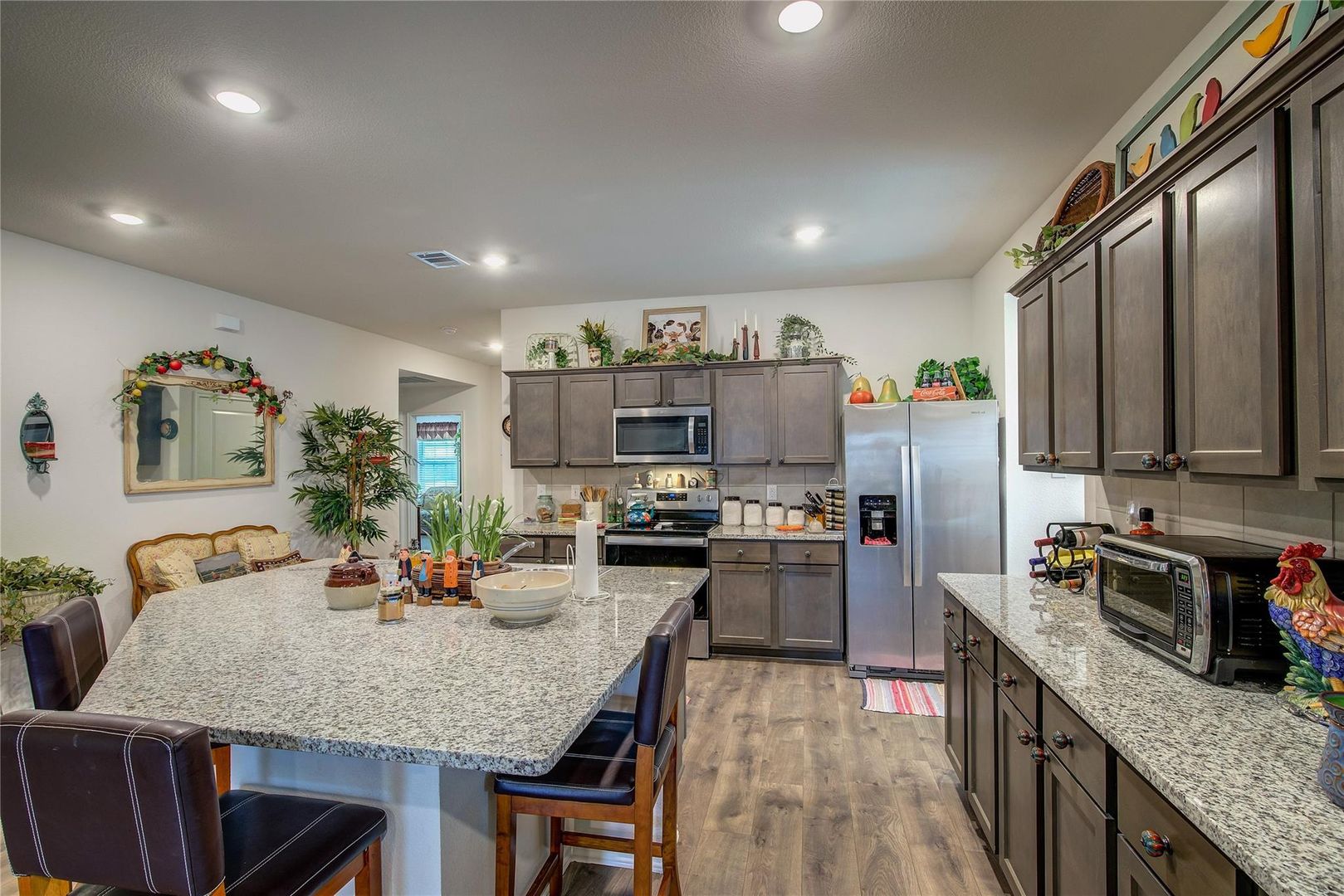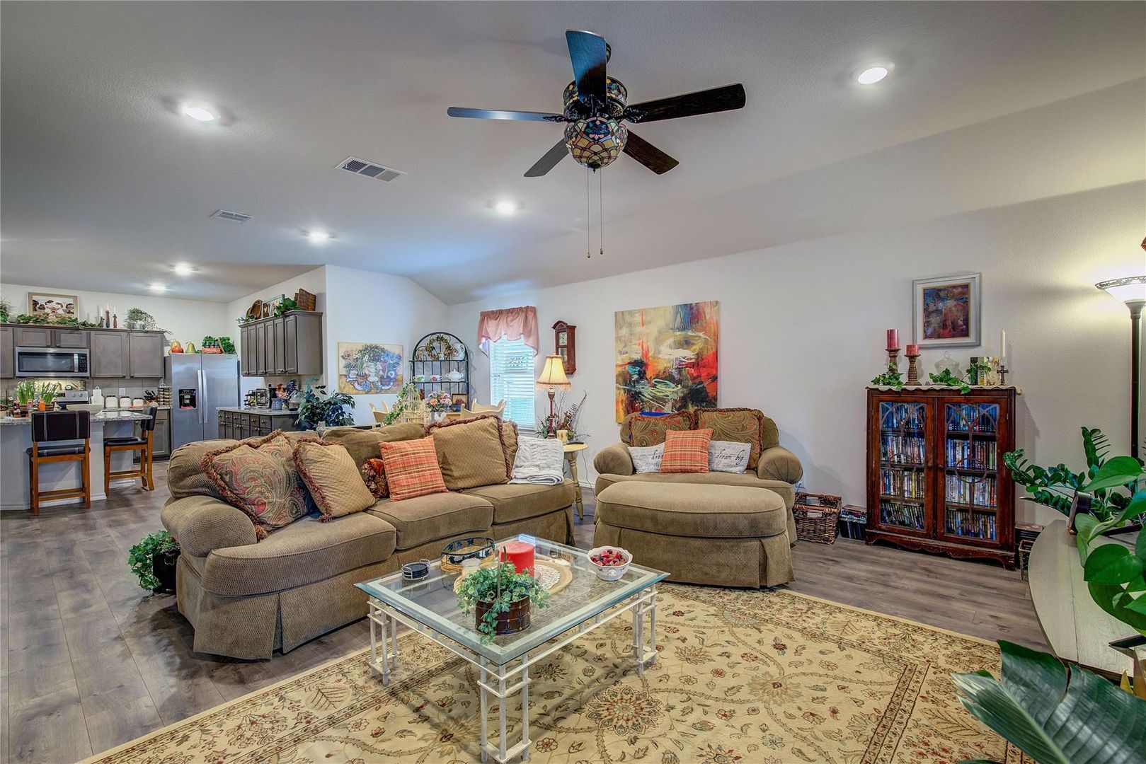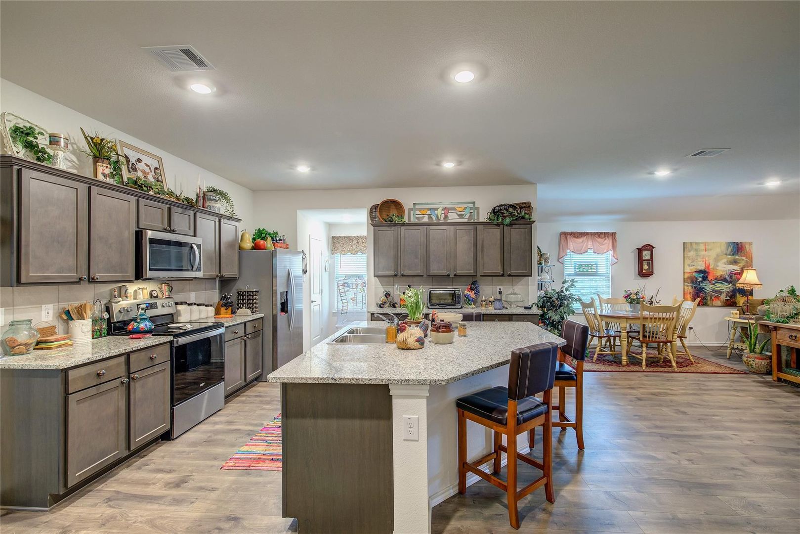 Beautiful home with four bedrooms on a large corner lot in a wonderful neighborhood. The open floor plan featuring a living area opening up to the dining area and island kitchen makes for a great layout for entertaining guests or enjoying family meals. The granite counters and stainless steel appliances are both practical and stylish additions to the kitchen. Nicely sized bedrooms including a large master suite. The private backyard with a covered and extended patio is also a great feature. It provides a nice outdoor living space where you can relax, grill out, or entertain guests. The storage building is also a convenient feature for storing lawn equipment or other items.