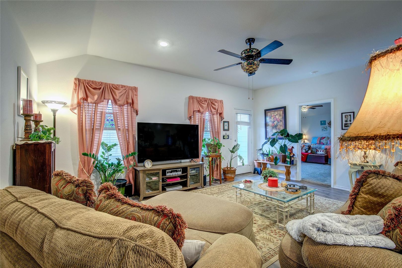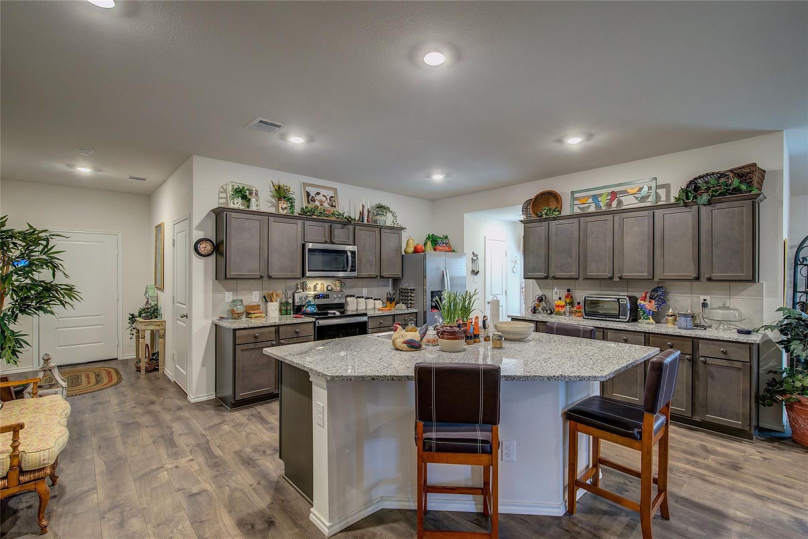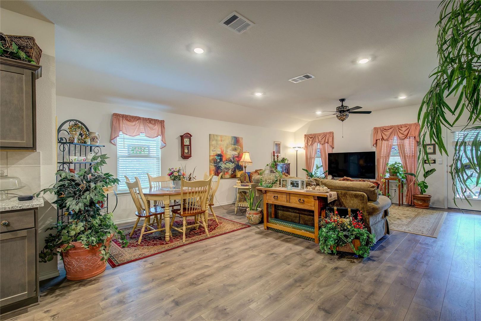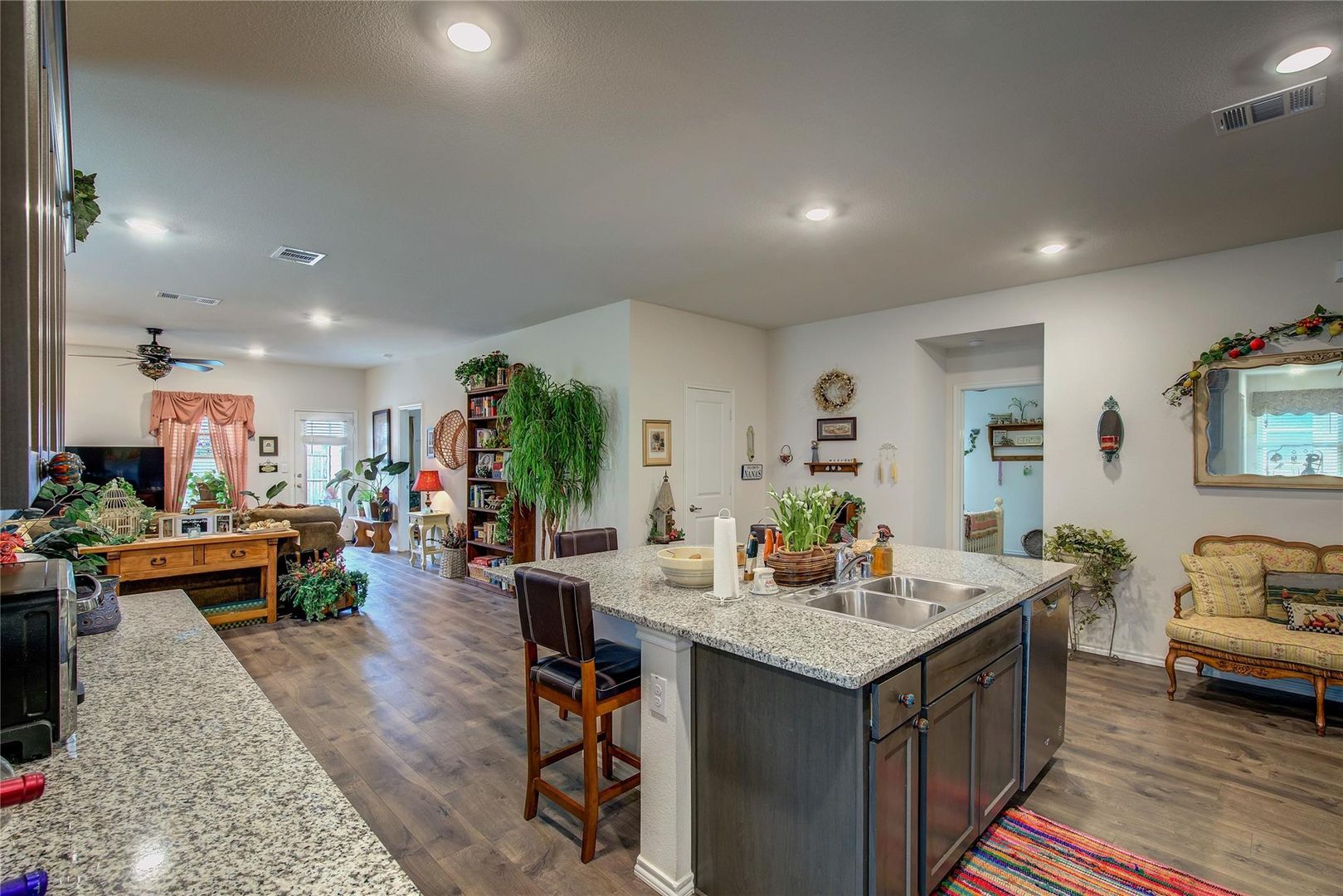 Beautiful home with four bedrooms on a large corner lot in a wonderful neighborhood. The open floor plan featuring a living area opening up to the dining area and island kitchen makes for a great layout for entertaining guests or enjoying family meals. The granite counters and stainless steel appliances are both practical and stylish additions to the kitchen. Nicely sized bedrooms including a large master suite. The private backyard with a covered and extended patio is also a great feature. It provides a nice outdoor living space where you can relax, grill out, or entertain guests. The storage building is also a convenient feature for storing lawn equipment or other items.
