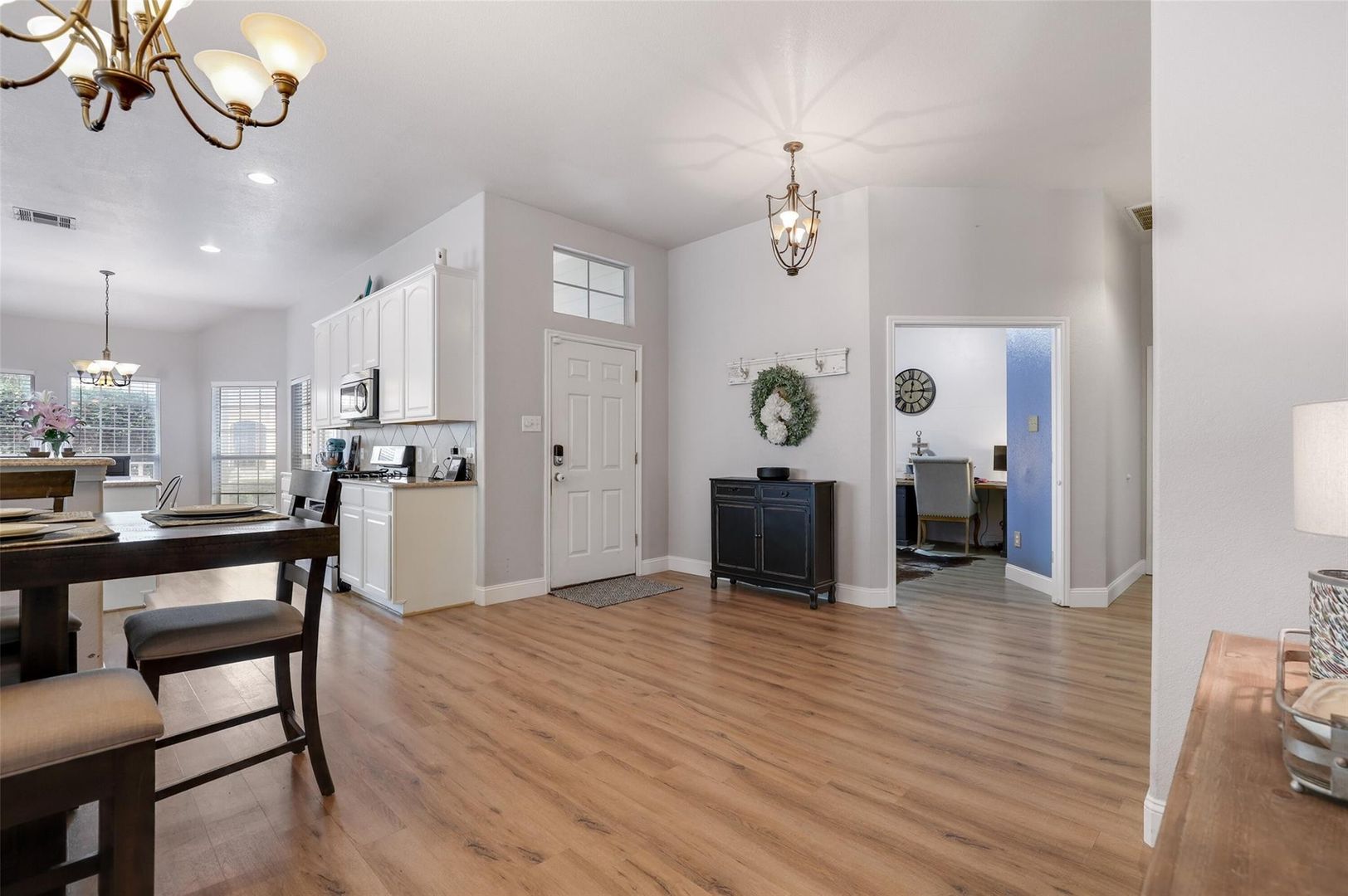 Beautiful house includes oversized covered Front Porch, features 4 Beds, 2 Baths, Study, Game room-Flex Area. Open floor plan has Luxury Vinyl Plank flooring. Spacious Living Rm with Gas Fireplace, Gas Logs & decorative Mantle. Natural light filled Kitchen with freshly painted cabinets, large farm sink, Granite countertops, Gas Range, SS Appliances, & Breakfast Area. Spacious Master Suite has a Walk In Shower and large closet. Secondary Bedrooms with walk in closets. Spectacular Screened In Sun Room leads to the Private backyard for summer Entertaining!