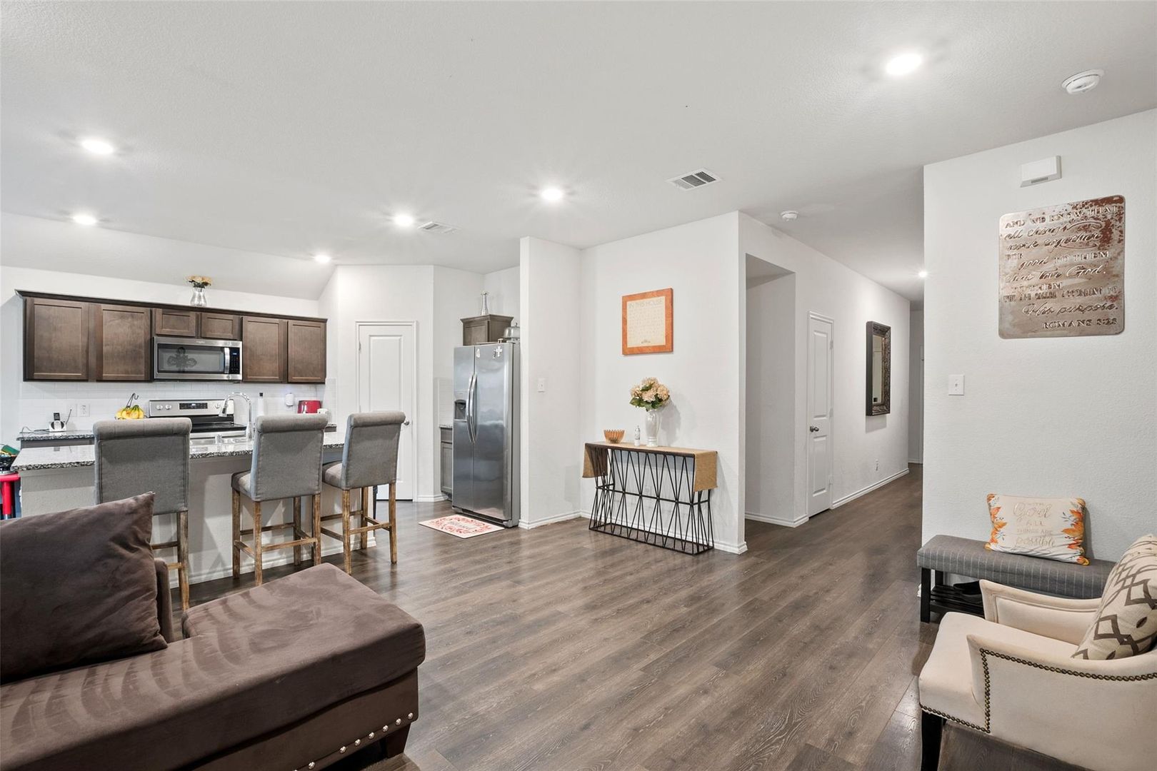 Charming 4-bedroom, 2-bath home with an open layout, spacious kitchen with oversized island, private primary suite, covered patio with TV, generous backyard, and access to a nearby community pool and playground.