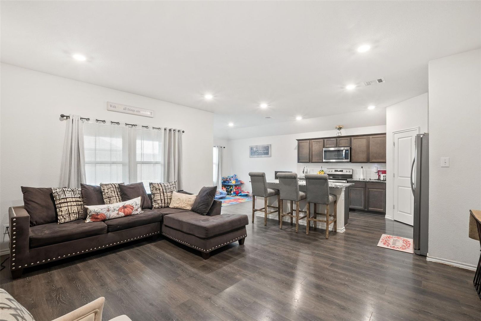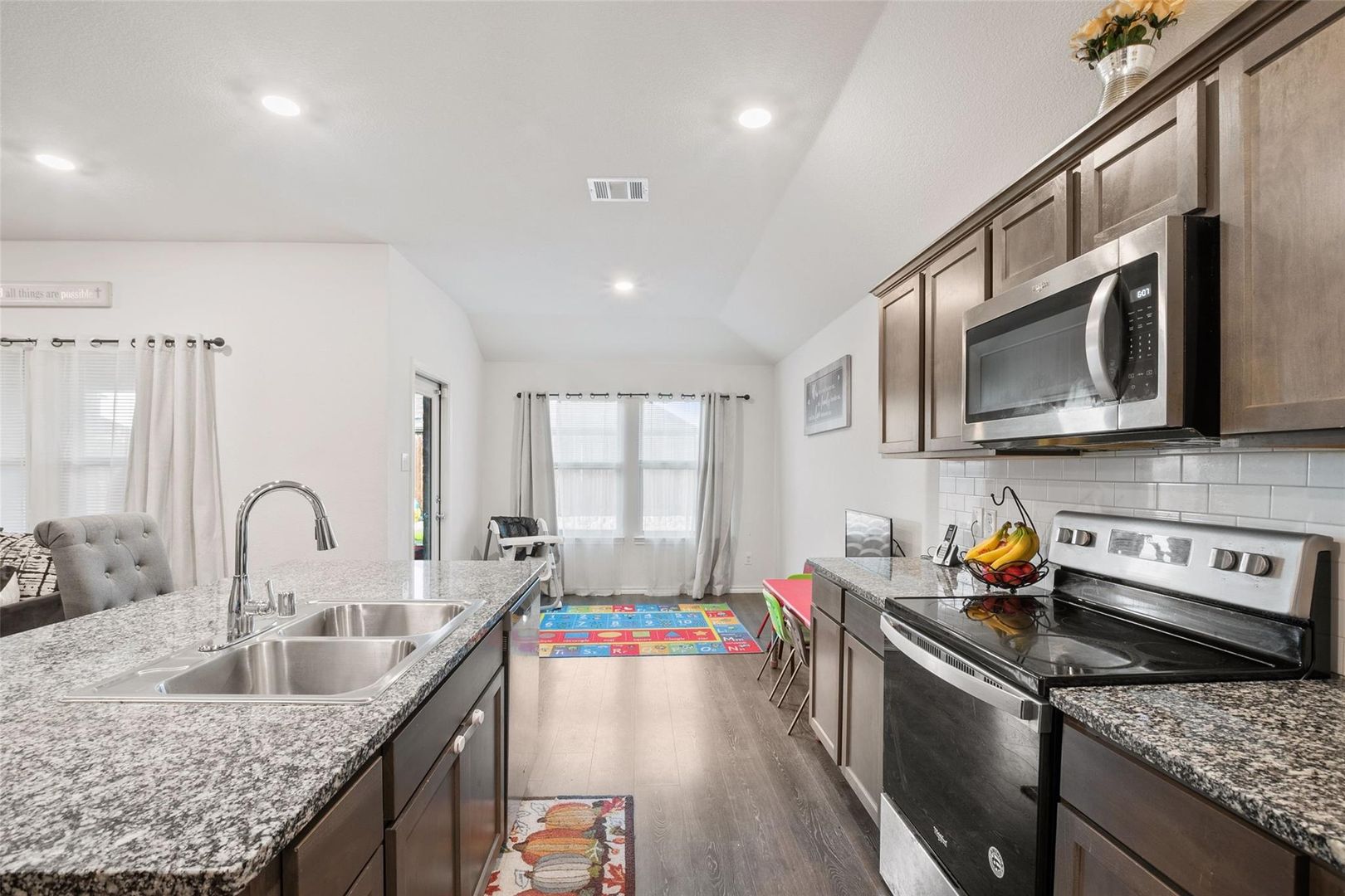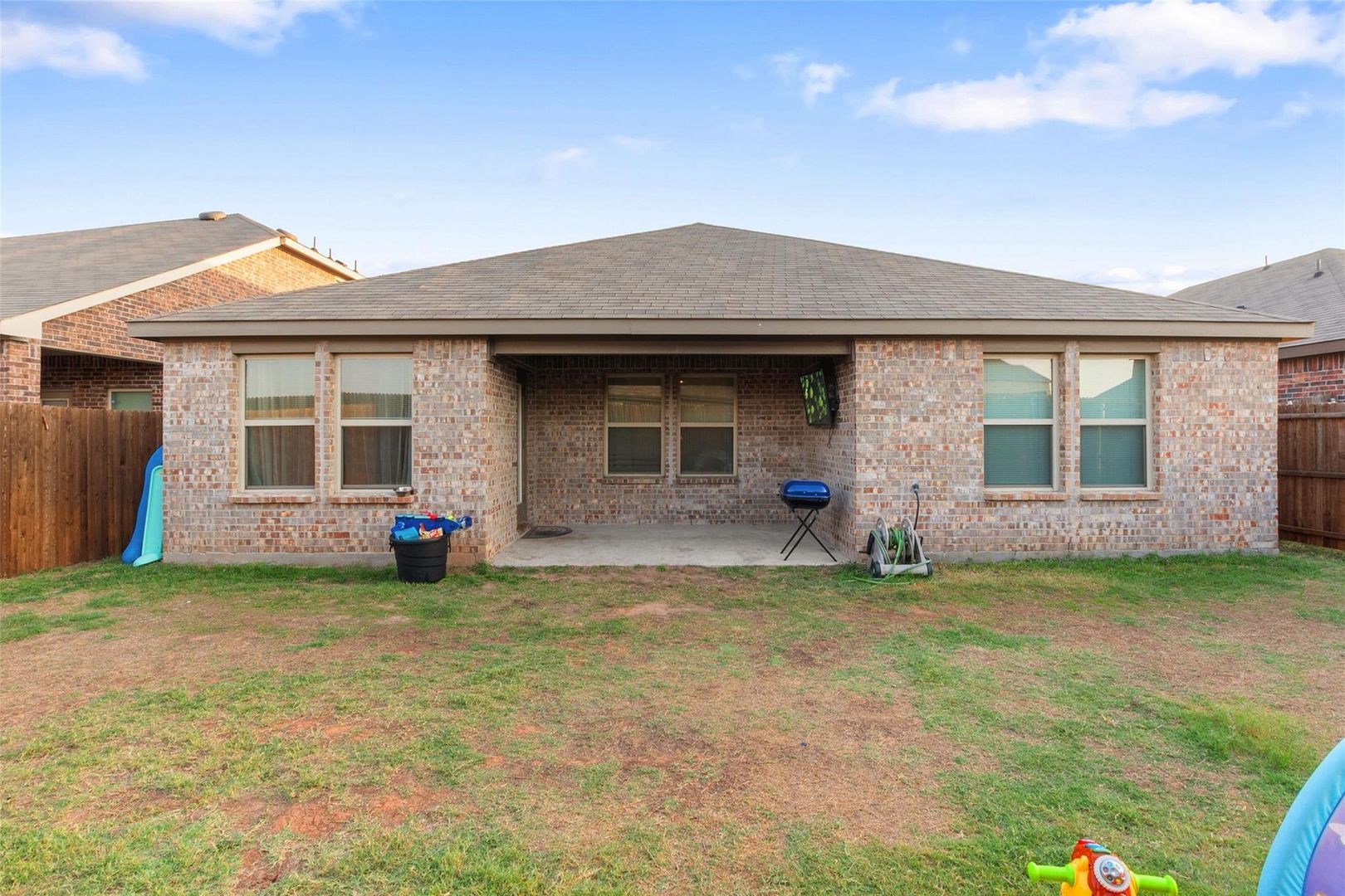 Welcome home to comfort, style, and everyday convenience! This inviting 4-bedroom, 2-bath residence offers a thoughtfully designed layout perfect for both relaxing and entertaining. The spacious kitchen is a true centerpiece, featuring generous counter space, abundant cabinetry, and an oversized island that seamlessly opens to the living and breakfast areas—ideal for gatherings or casual family meals. The private primary suite is tucked away from the secondary bedrooms, creating a peaceful retreat at the end of the day. Step outside to a covered patio complete with a mounted TV that conveys with the home, overlooking a nicely sized backyard ready for outdoor enjoyment. Located in a welcoming community with a pool and playground just a short walk away, this home delivers the perfect balance of neighborhood charm and easy access to city conveniences.