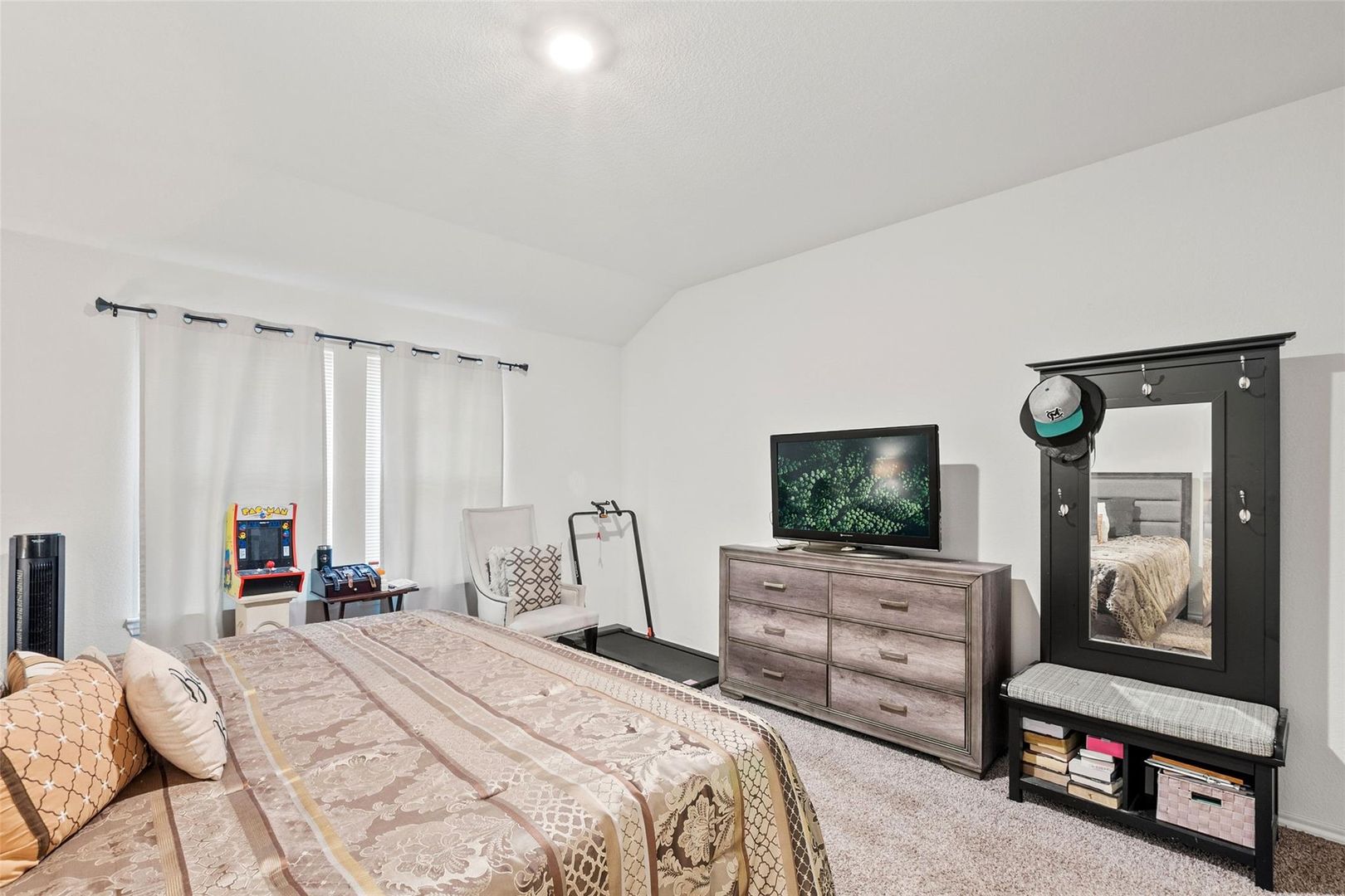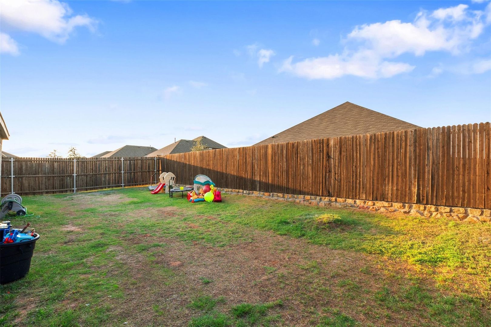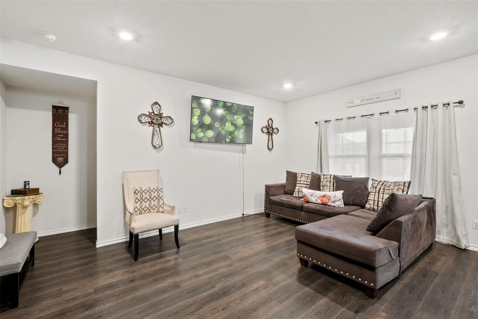 Welcome home to comfort, style, and everyday convenience! This inviting 4-bedroom, 2-bath residence offers a thoughtfully designed layout perfect for both relaxing and entertaining. The spacious kitchen is a true centerpiece, featuring generous counter space, abundant cabinetry, and an oversized island that seamlessly opens to the living and breakfast areas—ideal for gatherings or casual family meals. The private primary suite is tucked away from the secondary bedrooms, creating a peaceful retreat at the end of the day. Step outside to a covered patio complete with a mounted TV that conveys with the home, overlooking a nicely sized backyard ready for outdoor enjoyment. Located in a welcoming community with a pool and playground just a short walk away, this home delivers the perfect balance of neighborhood charm and easy access to city conveniences.