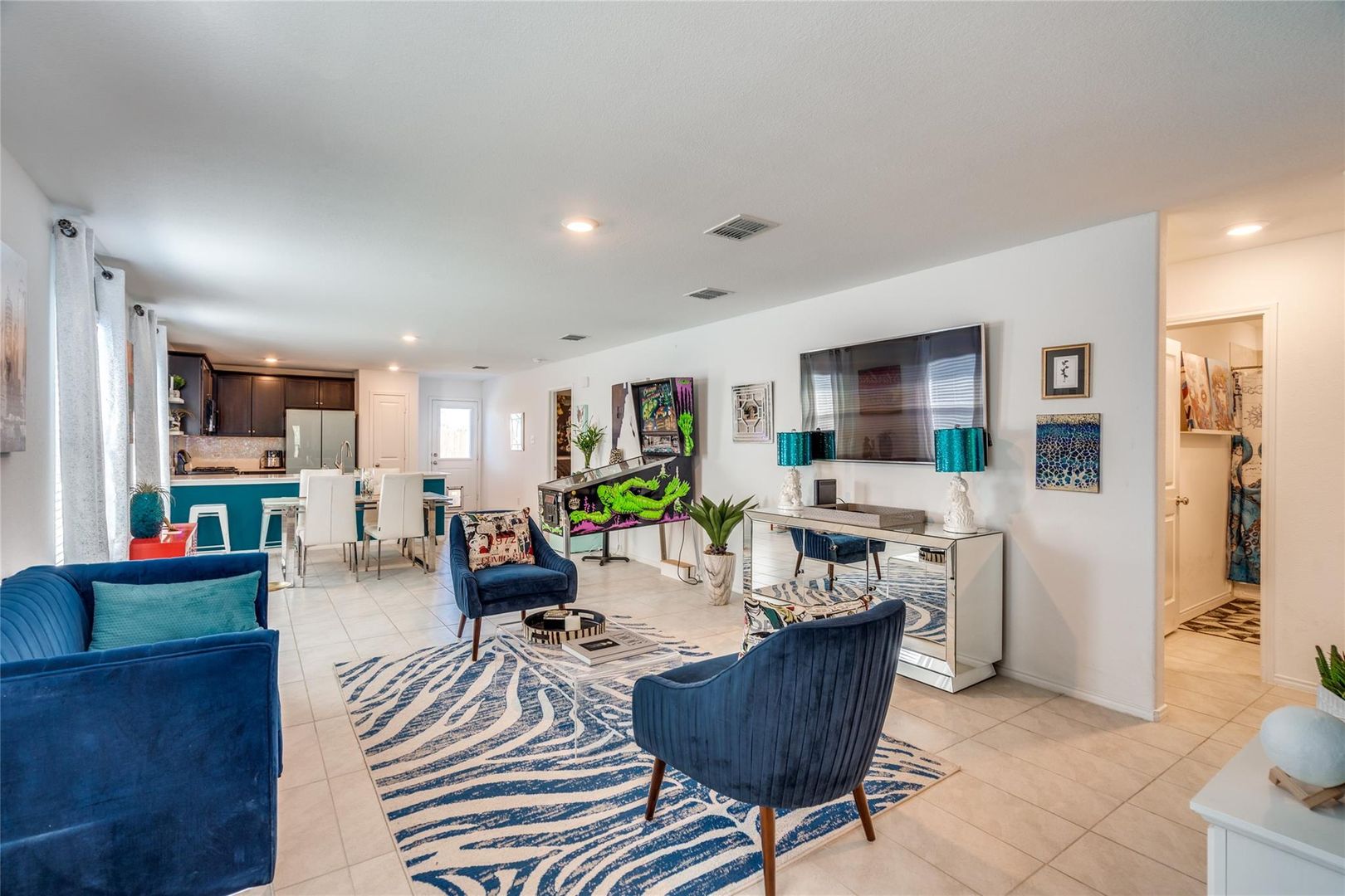 Discover the charm of this inviting single-story home, perfect for first-time buyers or those looking to downsize without sacrificing comfort. The open-concept layout seamlessly connects the family room, dining area, and modern kitchen, creating a bright and welcoming space for everyday living and entertaining. A convenient doggie door provides easy backyard access for your four-legged family members. Three thoughtfully designed bedrooms are located near the main living area, including a spacious owner’s suite just steps from the kitchen. The suite features a private ensuite bathroom and a generous walk-in closet. Ideally located just a couple of blocks from the amenity center with a lazy river, this home offers comfort, convenience, and an enjoyable lifestyle all in one.