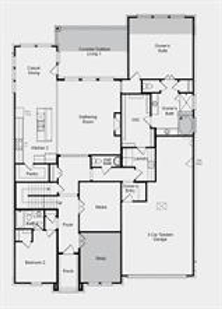 The Topaz plan features an elegant entryway flanked by a study and media room. The gourmet kitchen opens to a spacious gathering room and casual dining area, creating an ideal space for entertaining. The owner’s suite serves as a private retreat, complete with a generous walk-in closet. For added convenience, the laundry room is accessible from both the owner’s entry and the suite. A downstairs guest bedroom offers comfort and privacy for visitors. Upstairs, you'll find additional secondary bedrooms and a versatile game room. Available structural options include: Gourmet Kitchen 2, extended owner’s suite, covered outdoor living area, drop-in tub in the owner’s bath, and a dedicated study.