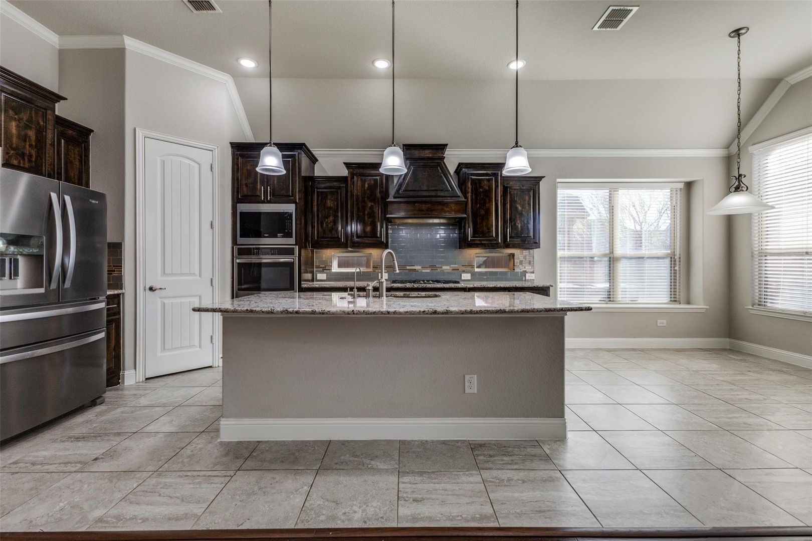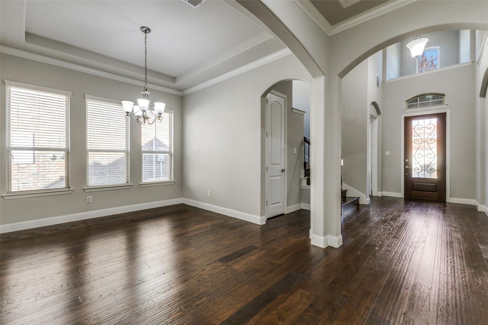 This elegant two-story home in Hudson Heights, part of EXEMPLARY Plano ISD, features a striking stone and brick façade and a DOUBLE-HEIGHT foyer leading to a private OFFICE and FORMAL DINING ROOM